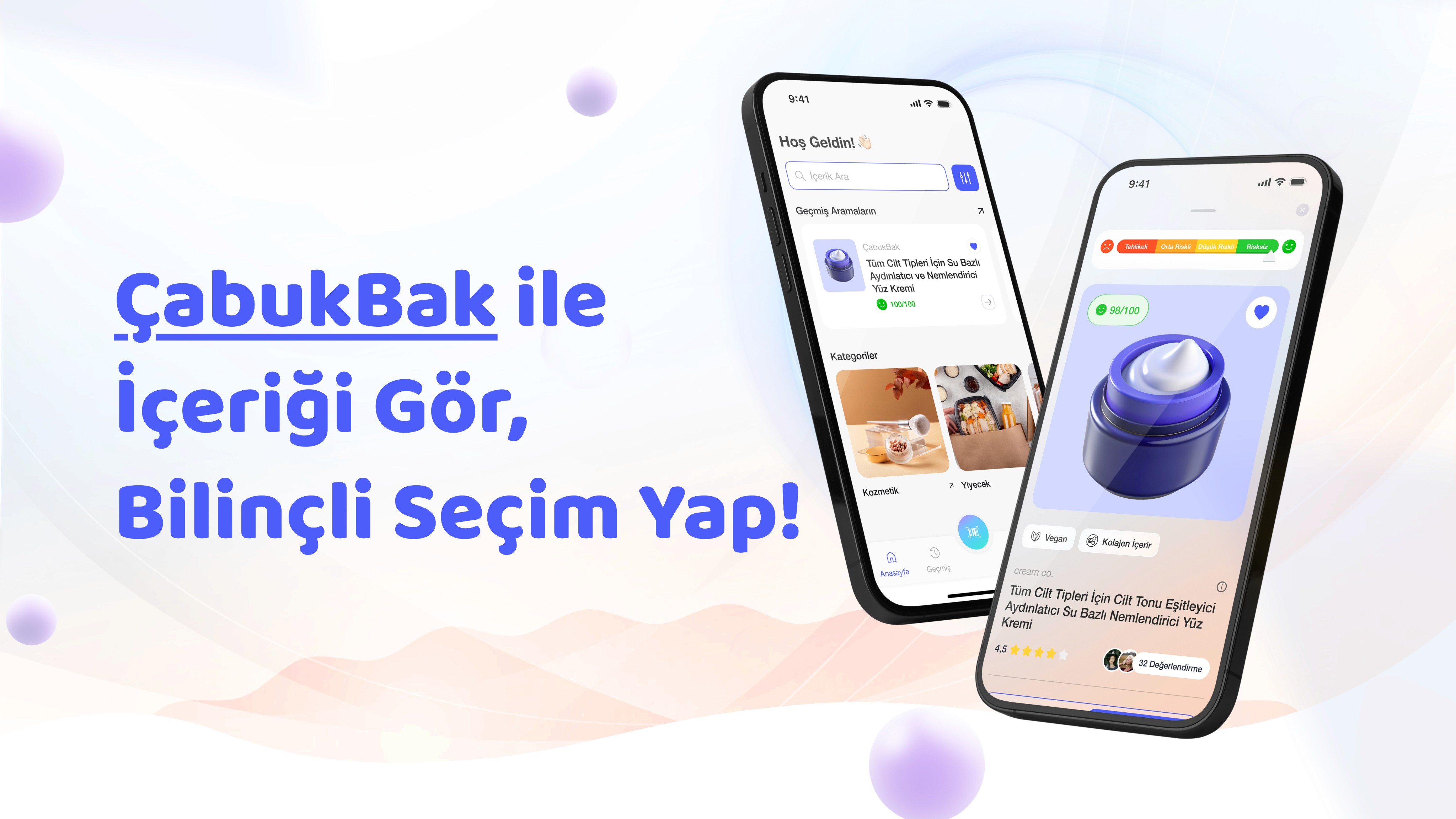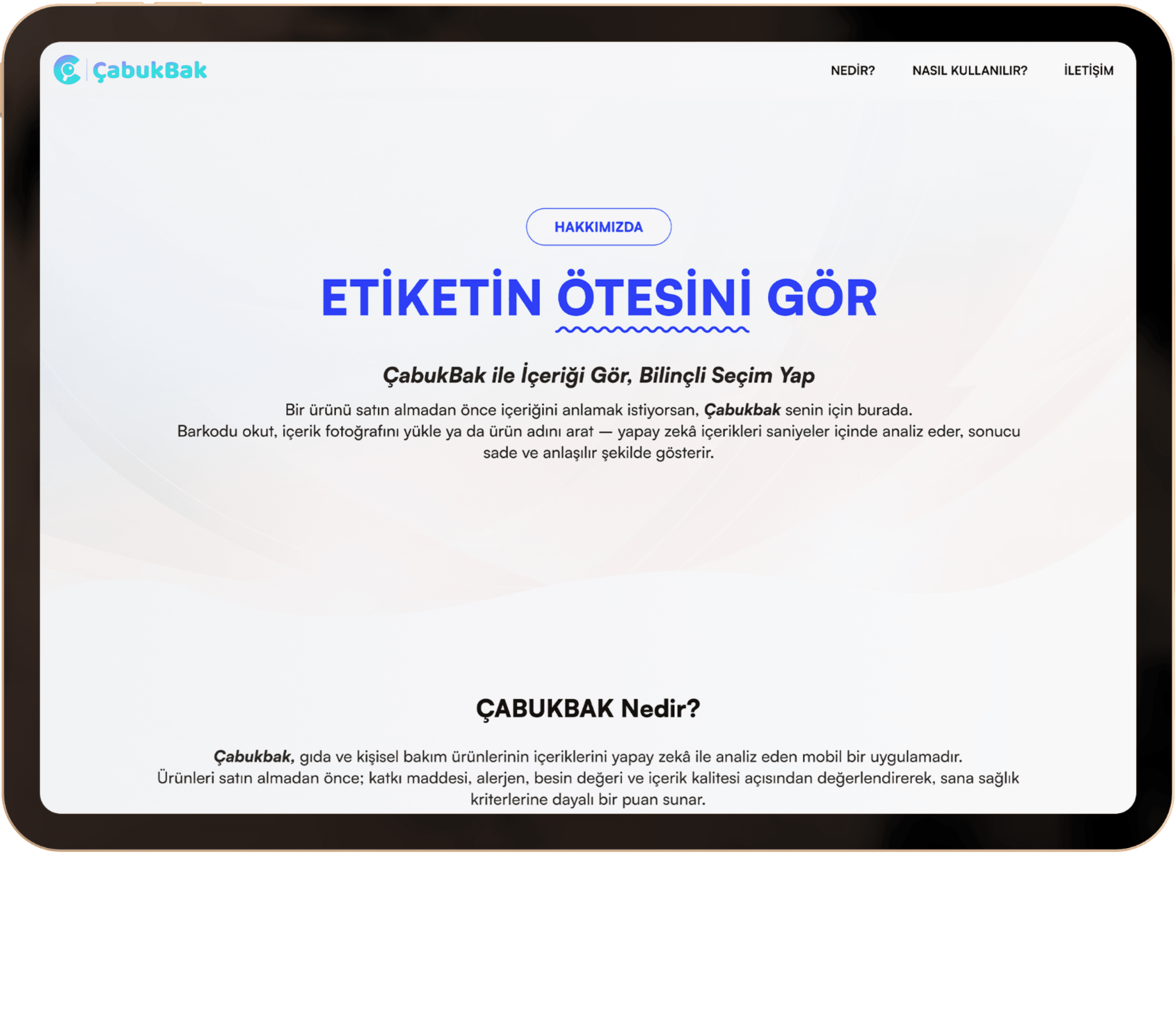 ÇabukBak is a mobile application that analyzes the contents of food and personal care products using artificial intelligence. It evaluates additives, allergens, nutritional value, and overall content quality, providing a health-based scoring system. With barcode scanning, photo upload, and product name search features, it delivers instant analysis within seconds. Through AI-powered content analysis, ÇabukBak presents clear and reliable results, aiming to help users make conscious, fast, and healthy choices.