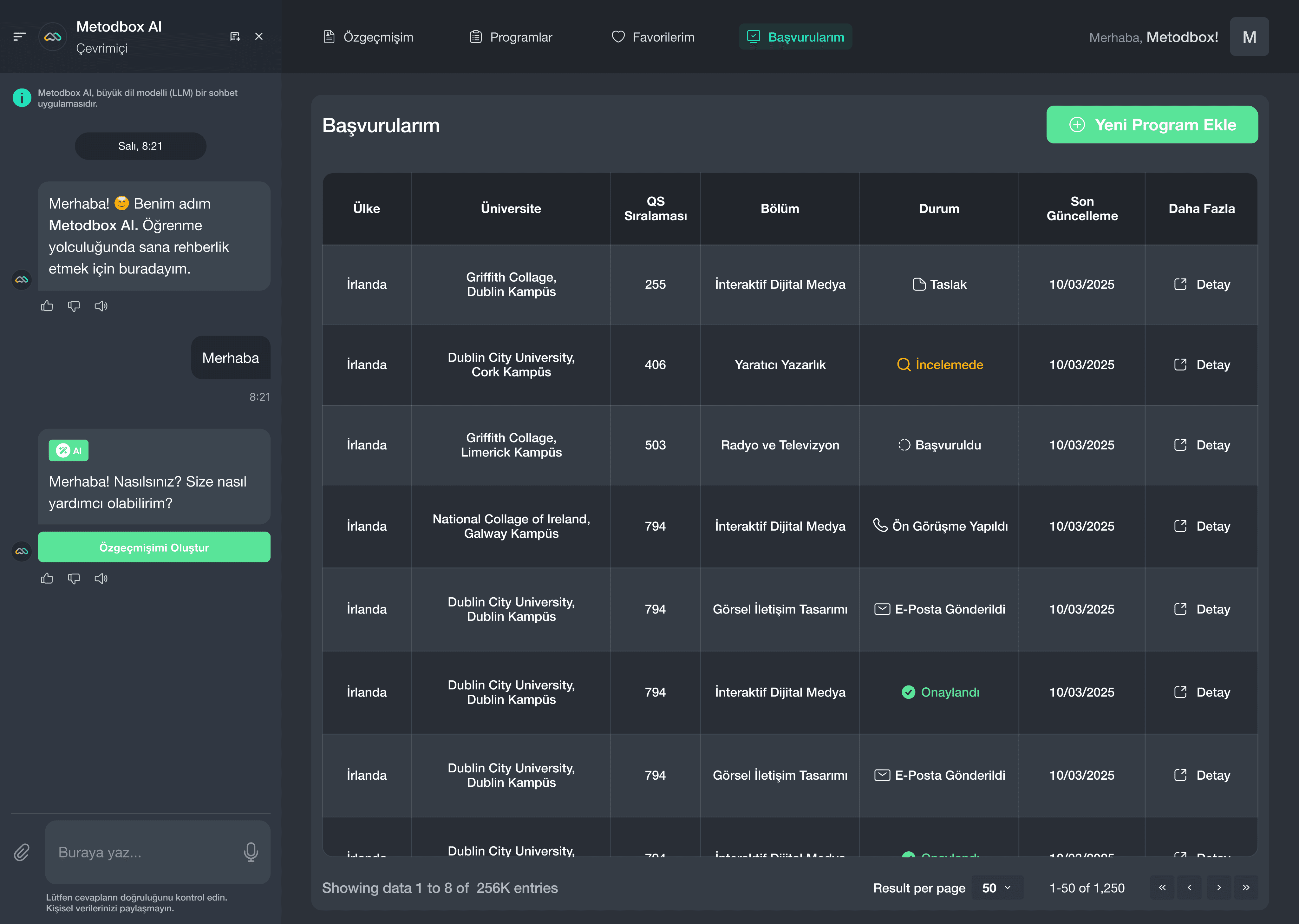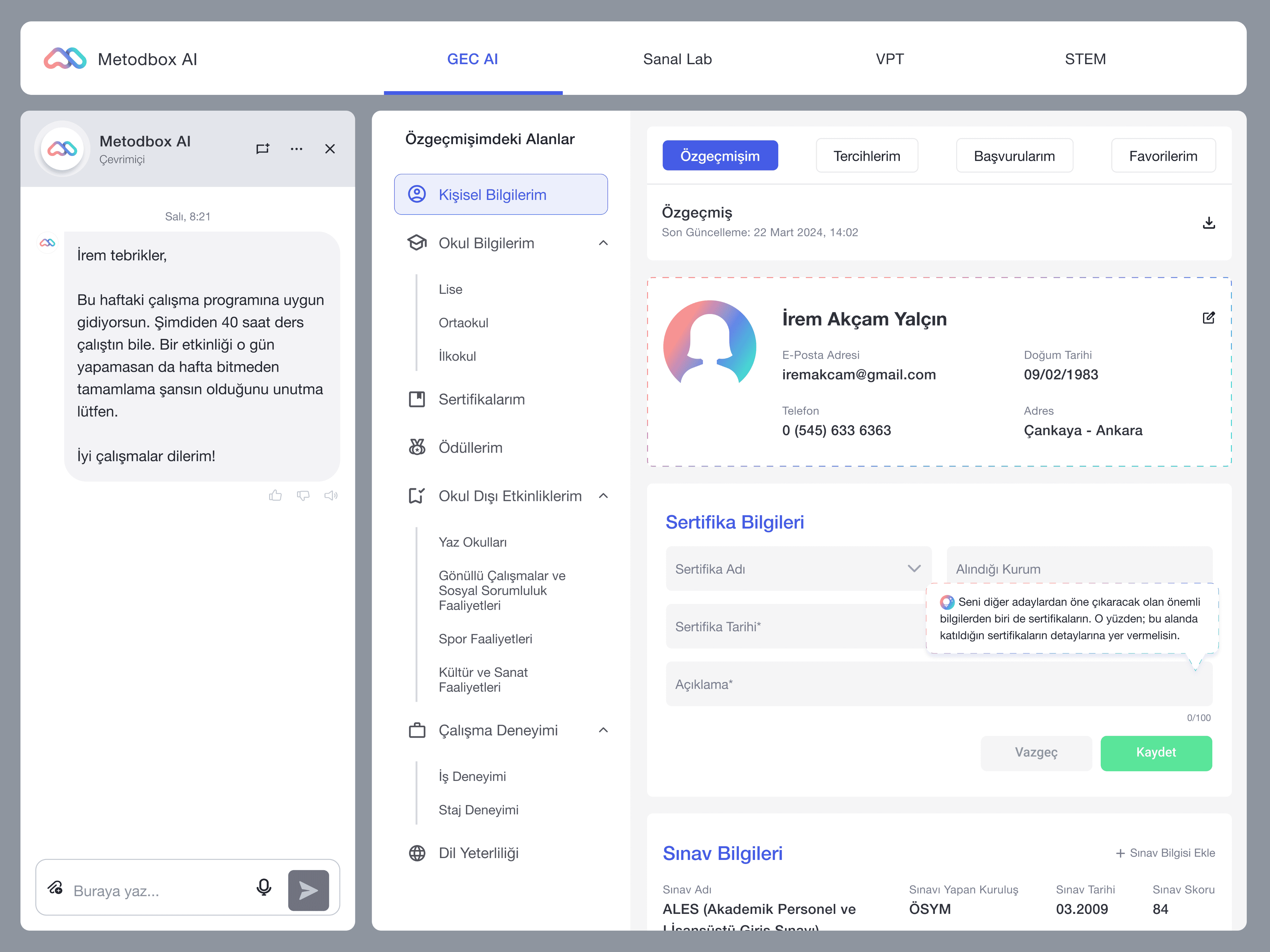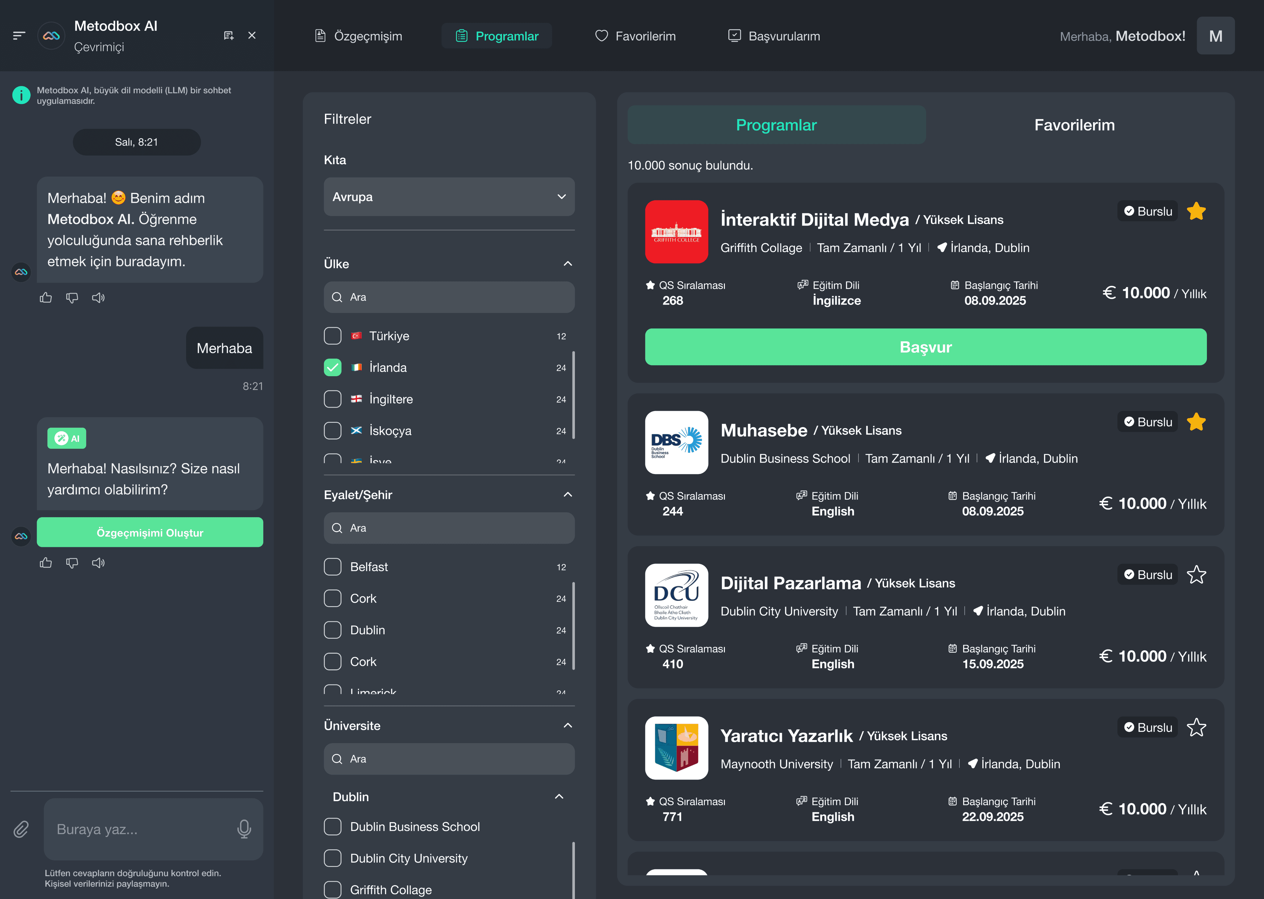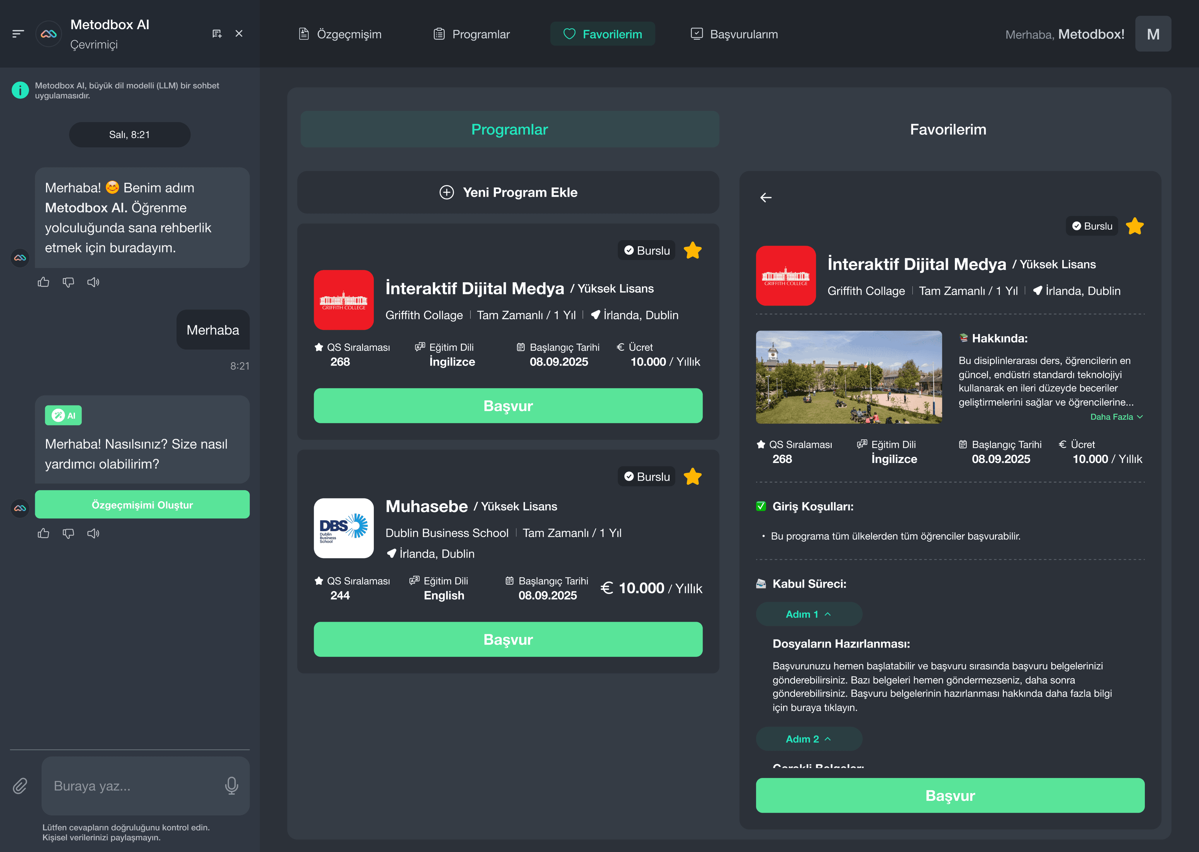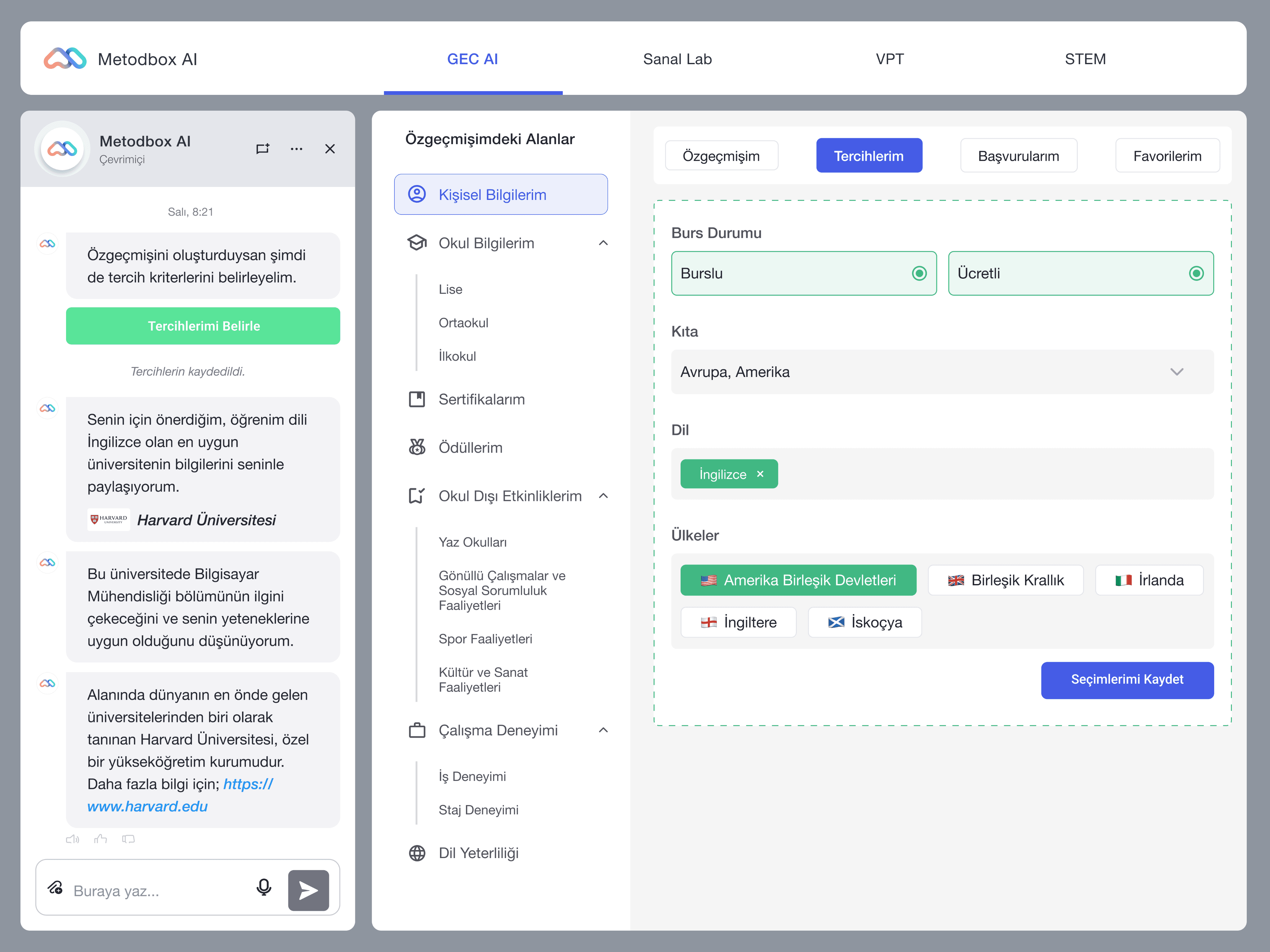 Within Metodbox AI, the Global Education Center (GEC) offers AI-powered guidance tools that support students in their university selection process. It helps them explore both domestic and international university options and make informed choices aligned with their interests and goals.