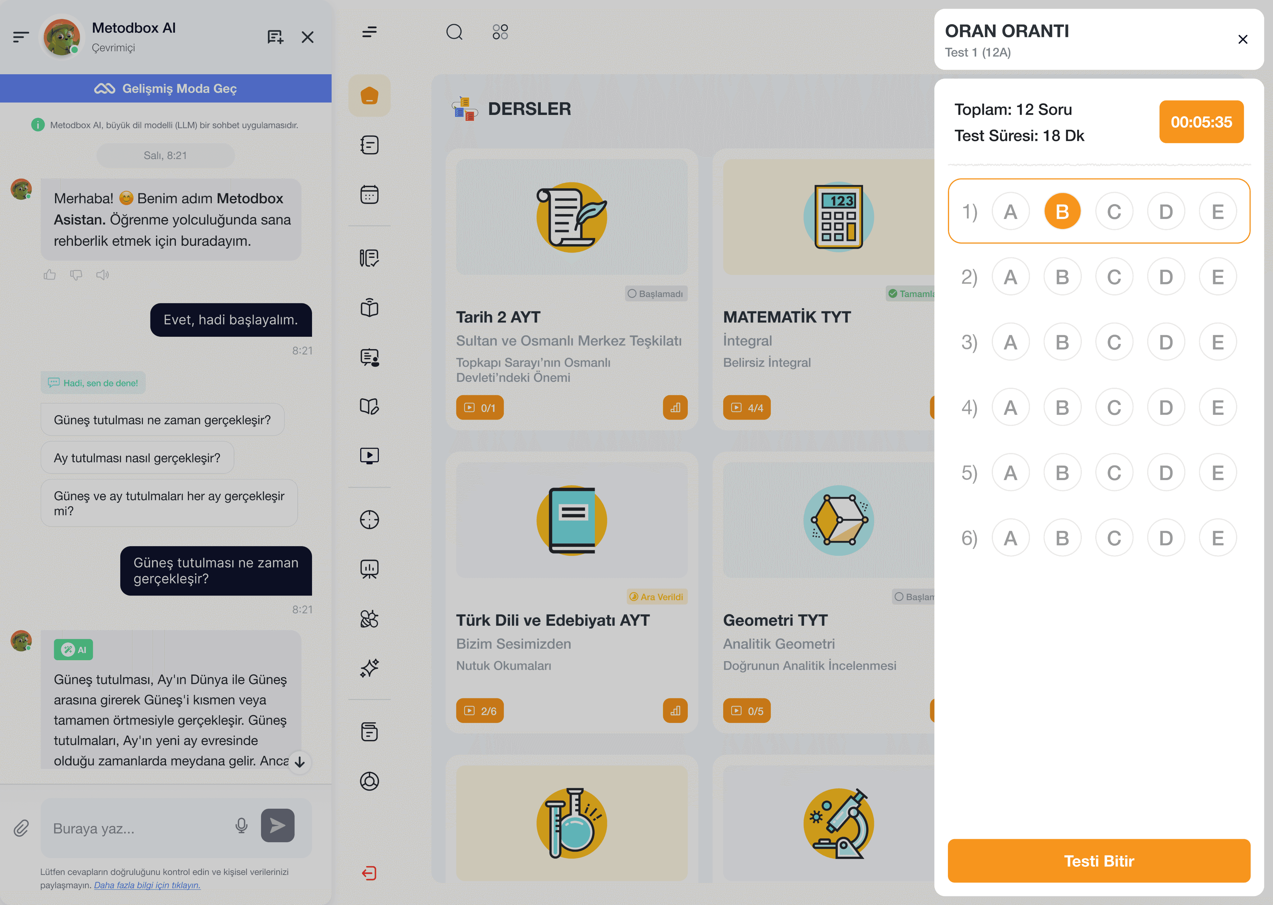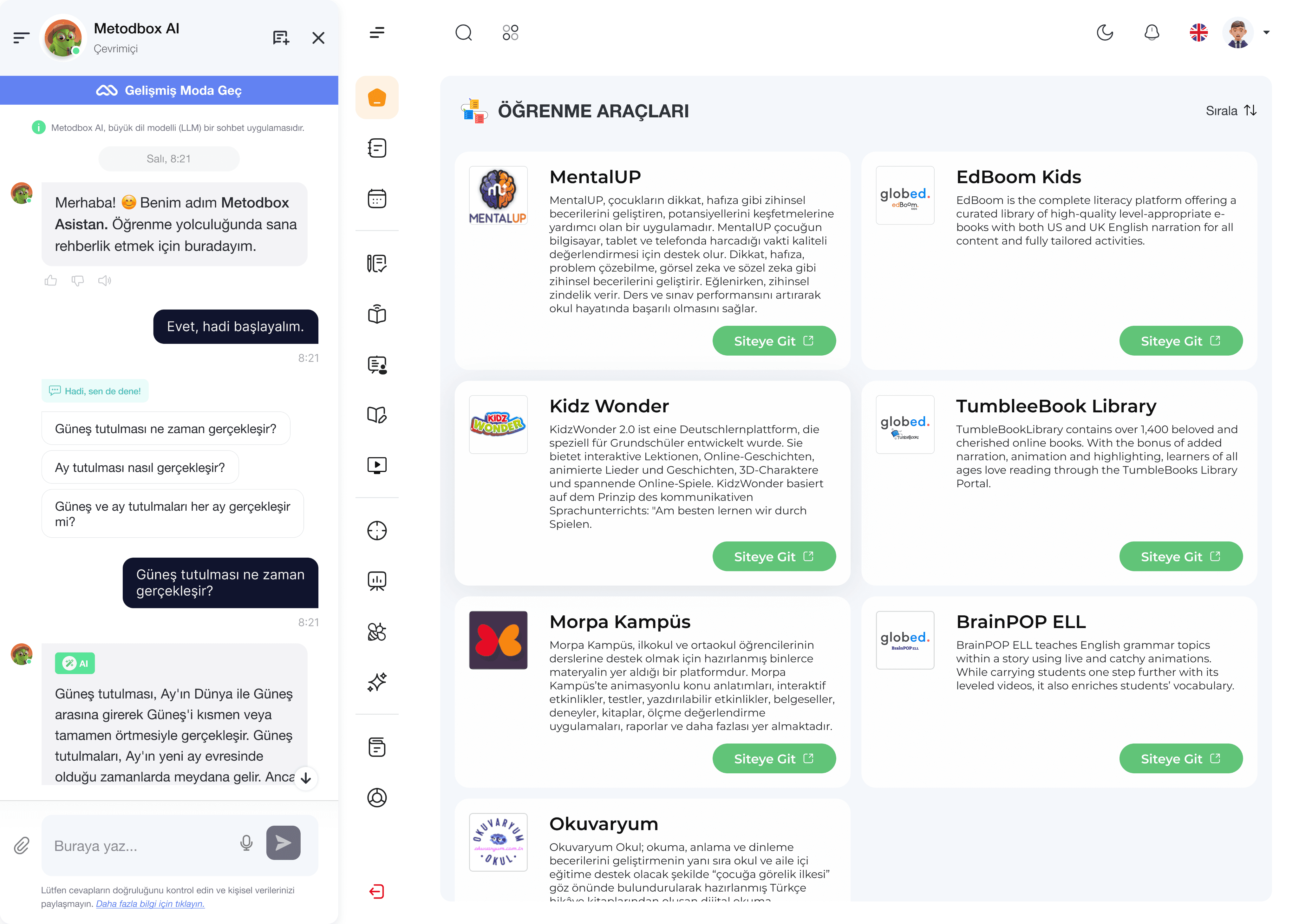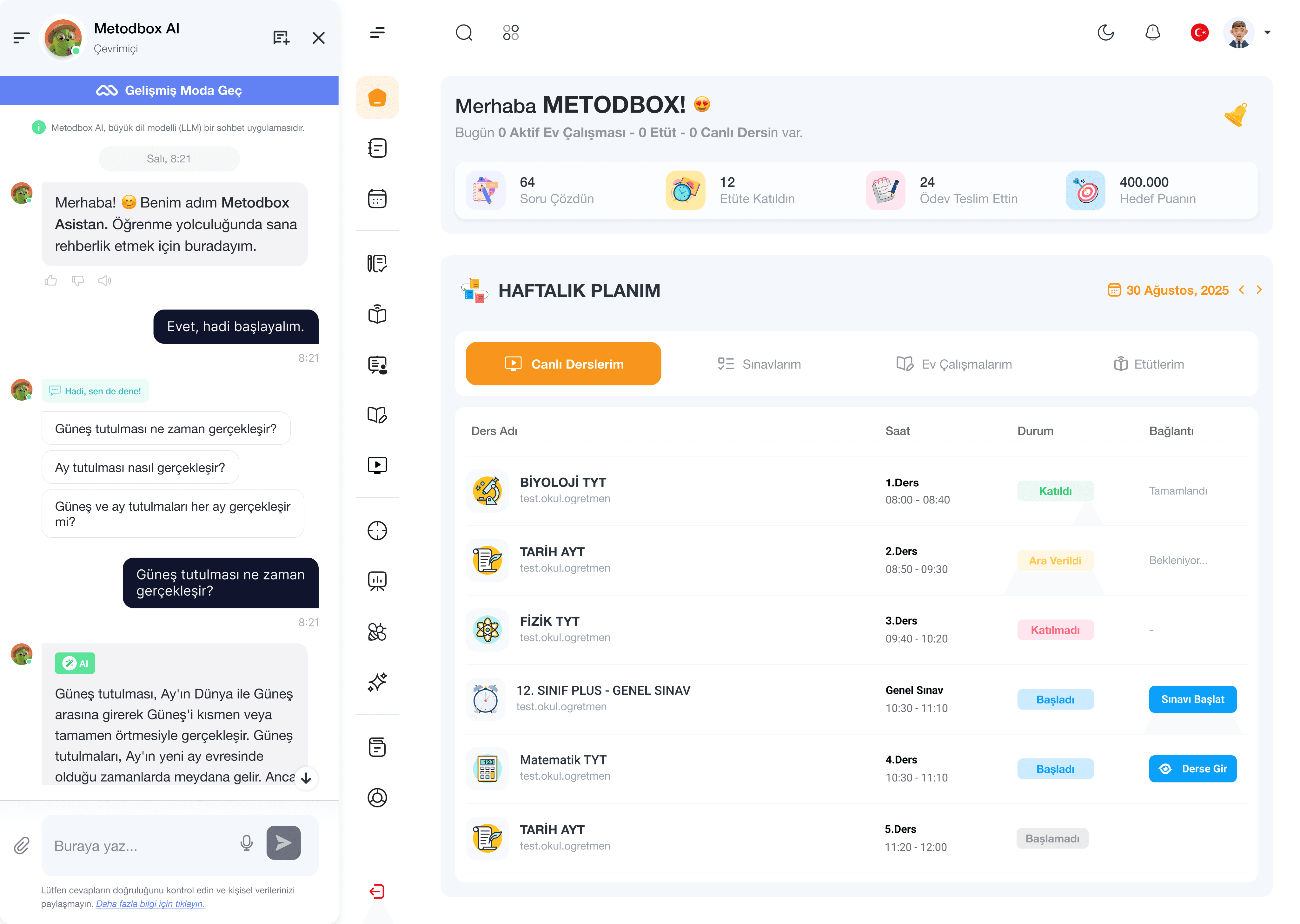 Metodbox is a digital education platform designed for students, teachers, school administrators, and parents, covering the K‑12 level through university preparation. It offers AI-powered performance tracking, personalized content, assignment and exam management features. Accessible via both web and mobile applications, it simplifies the learning process with a user-friendly interface and provides advanced analytics tools for all stakeholders.